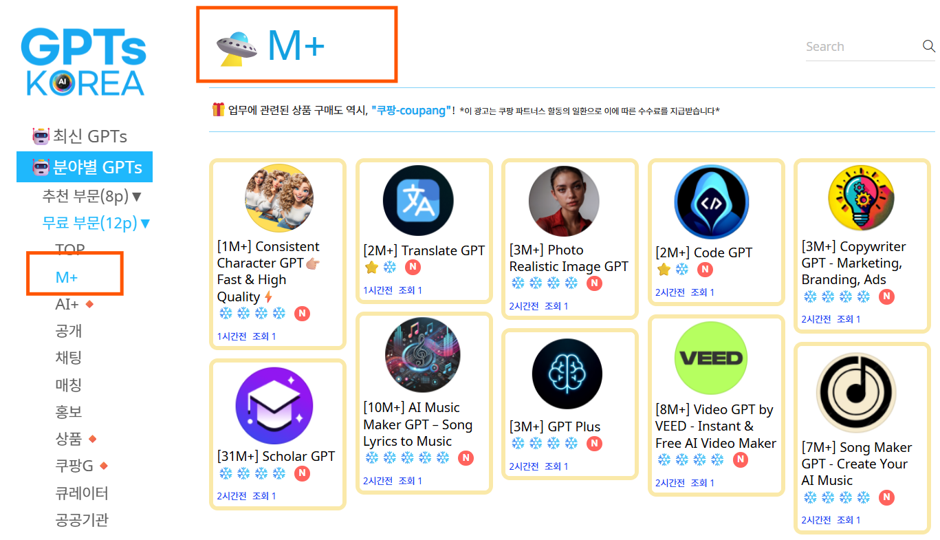 이에 백만사용자가 넘는 GPTs만을 안내해 주는 신설메뉴"M+"를 신설했습니다, 평가 4.0 이상만 알려드립니다.