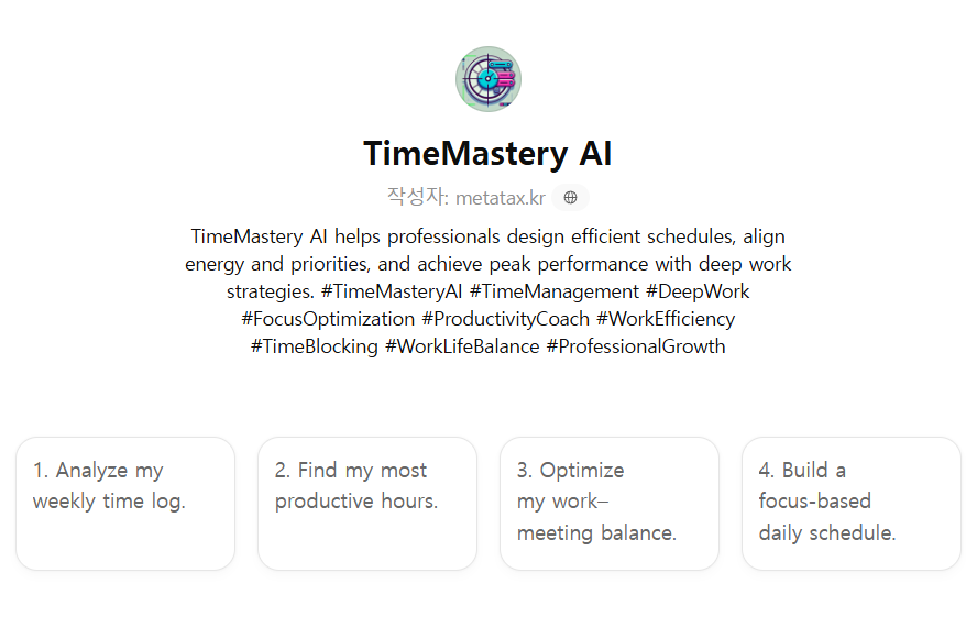 TimeMastery AI는 전문가들이 효율적인 일정을 설계하고, 에너지와 우선순위를 조정하고, 심층적인 업무 전략을 통해 최고의 성과를 달성하도록 돕습니다. #TimeMasteryAI #시간관리 #심층작업 #집중최적화 #생산성코치 #업무효율성 #시간차단 #일과삶의균형 #전문적성장 #AIPlanner