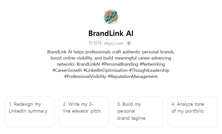 BrandLink AI는 전문가들이 진정성 있는 개인 브랜드를 구축하고, 온라인 가시성을 높이며, 의미 있는 커리어 발전 네트워크를 구축할 수 있도록 지원합니다. BrandLinkAI #개인브랜딩 #네트워킹 #경력성장 #LinkedIn최적화 #사고리더십 #전문가적 가시성 #평판관리 #AI브랜딩 #진정한 영향력