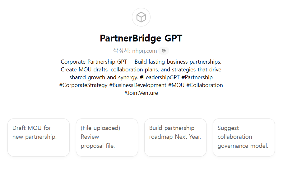 CEO, 전략기획실, 사업개발팀, 대외협력부서가 전략적 제휴(Strategic Alliance), MOU, 공동사업 개발, 산업 협력 모델 구축을 체계적으로 설계할 수 있도록 만든 파트너십 전략·관계관리형 GPT입니다.