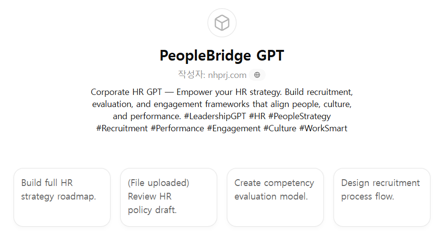 CHRO, 인사팀, 조직문화 담당자, 리더십 개발팀이 채용·인사평가·보상·인재육성·조직문화 구축 등 전사적 HR 업무를 체계적으로 수행할 수 있도록 설계된 전략적 인사·조직관리형 GPT입니다.
