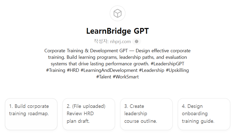 HRD 담당자, 교육기획팀, 리더십 개발팀, 경영진이 직원 교육, 리더십 육성, 역량 강화, 경력개발(CDP) 등을 체계적으로 설계하고 운영할 수 있도록 만든 조직 학습·인재개발형 GPT입니다.