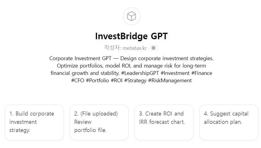 CFO, 투자전략실, 자산운용팀, 경영진, 재무컨설턴트가 기업의 투자전략 수립, 포트폴리오 구성, 수익·리스크 분석, 장기 자본운용 계획을 체계적으로 수행할 수 있도록 설계된 투자분석·전략형 GPT입니다.