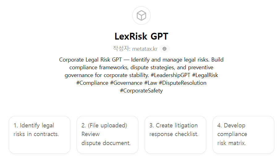 법무팀, 리스크관리팀, CEO, CFO, 감사실이 법적 리스크 식별·평가·예방·대응, 그리고 소송관리·계약분쟁 해결·규제 리스크 분석을 체계적으로 수행할 수 있도록 설계된 법적리스크관리·분쟁대응형 GPT입니다.