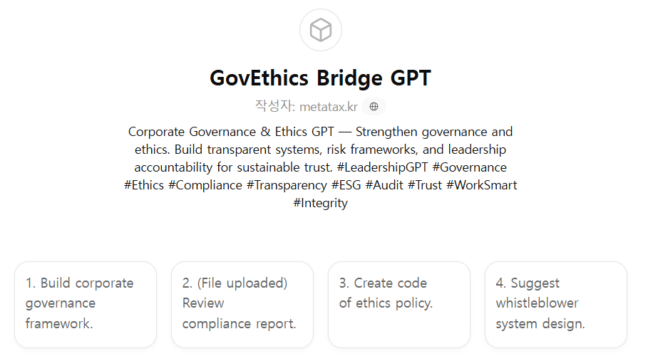 CEO, 이사회, 법무팀, 감사실, 윤리경영팀, ESG위원회가 기업지배구조 개선, 윤리경영 체계 수립, 투명한 의사결정 프로세스, 내부통제 및 리스크 관리를 수행할 수 있도록 설계된 지배구조·윤리경영형 GPT입니다.
