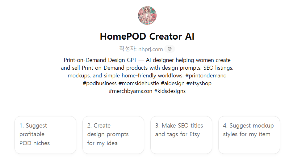 경단녀가 디자인 경험 없이도, 집에서 티셔츠·스티커·엽서·머그·폰케이스 등 POD 상품을 자동 생성·등록·판매할 수 있게 돕는 GPT