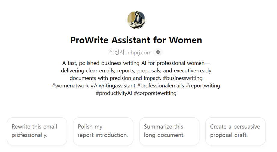 전문직 여성을 위한 빠르고 세련된 비즈니스 문서 작성 AI - 정확하고 임팩트 있는 명확한 이메일, 보고서, 제안서 및 임원용 문서를 제공합니다.