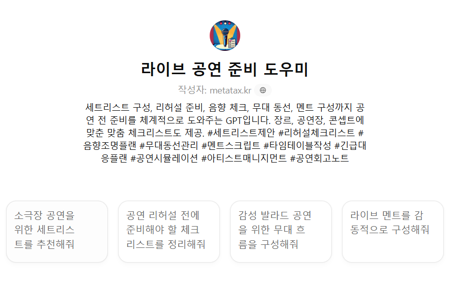 https://chatgpt.com/g/g-68bffb3a8e3881919568f91fe93c7c95-raibeu-gongyeon-junbi-doumi