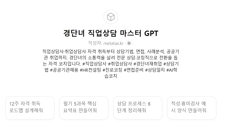 #직업상담사 #취업상담사 #경단녀재취업 #상담기법 #공공기관채용 #HR컨설팅 #진로코칭 #면접준비 #상담일지 #AI학습코치