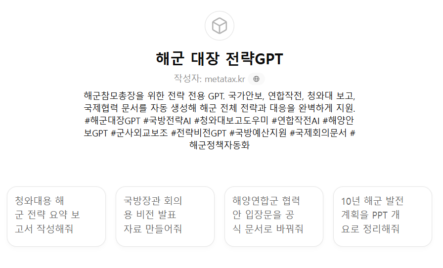 #해군대장GPT #국방전략AI #청와대보고도우미 #연합작전AI #해양안보GPT #군사외교보조 #전략비전GPT #국방예산지원 #국제회의문서 #해군정책자동화