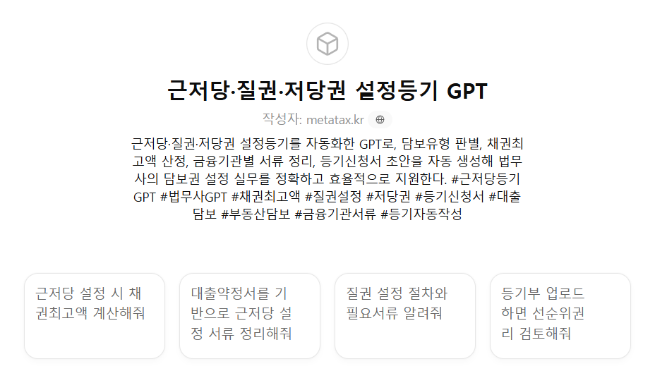 근저당·질권·저당권 설정등기를 자동화한 GPT로, 담보유형 판별, 채권최고액 산정, 금융기관별 서류 정리, 등기신청서 초안을 자동 생성해 법무사의 담보권 설정 실무를 정확하고 효율적으로 지원한다.