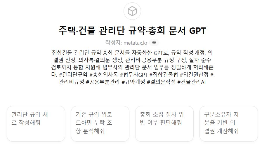 집합건물 관리단 규약·총회 문서를 자동화한 GPT로, 규약 작성·개정, 의결권 산정, 의사록·결의문 생성, 관리비·공용부분 규정 구성, 절차 준수 검토까지 통합 지원해 법무사의 관리단 문서 업무를 정밀하게 처리해준다.