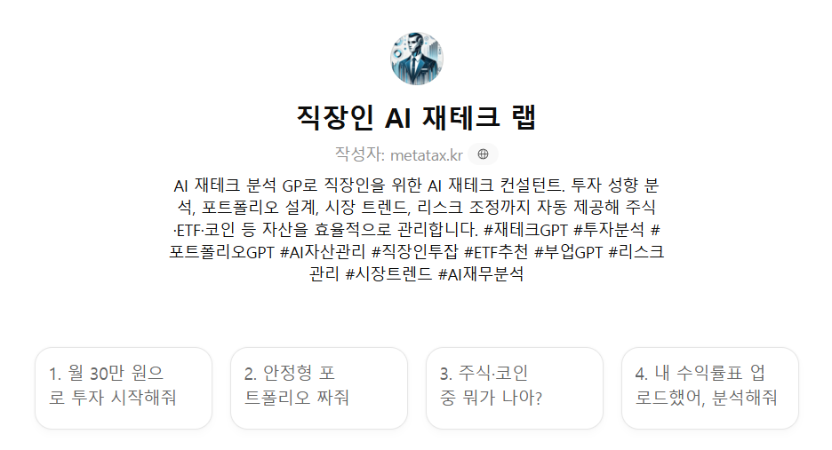 #재테크GPT #투자분석 #포트폴리오GPT #AI자산관리 #직장인투잡 #ETF추천 #부업GPT #리스크관리 #시장트렌드 #AI재무분석