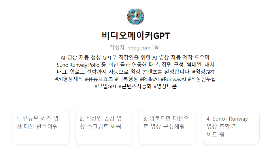 AI 영상 자동 생성 GPT로 직장인을 위한 AI 영상 자동 제작 도우미. Suno·Runway·Pollo 등 최신 툴과 연동해 대본, 장면 구성, 썸네일, 해시태그, 업로드 전략까지 자동으로 영상 콘텐츠를 완성합니다.
