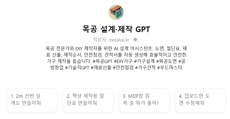#목공GPT #DIY가구 #가구설계 #목공도면 #공방창업 #기술직GPT #재료산출 #안전점검 #가구견적 #우드마스터