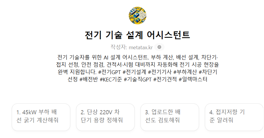 #전기GPT #전기설계 #전기기사 #부하계산 #차단기선정 #배전반 #KEC기준 #기술직GPT #전기견적 #일렉마스터
