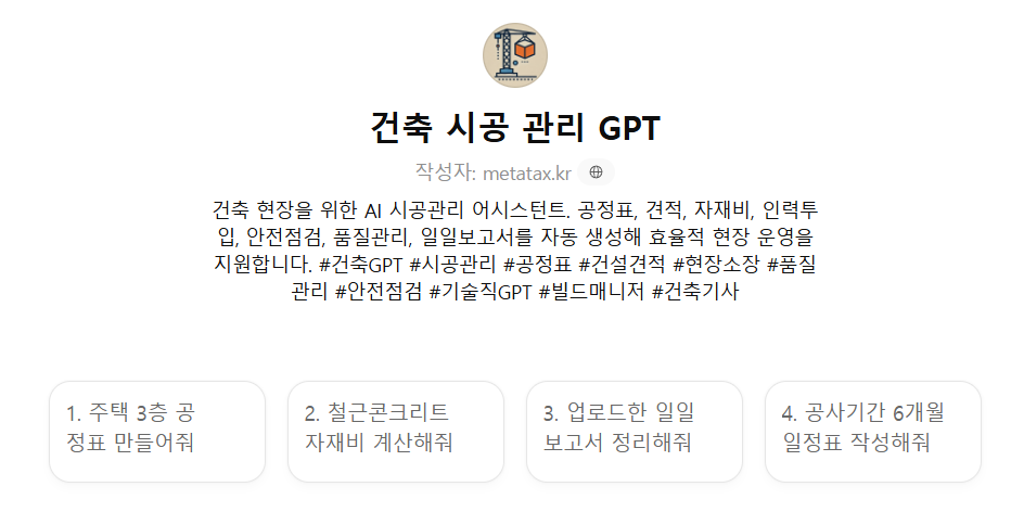 #건축GPT #시공관리 #공정표 #건설견적 #현장소장 #품질관리 #안전점검 #기술직GPT #빌드매니저 #건축기사