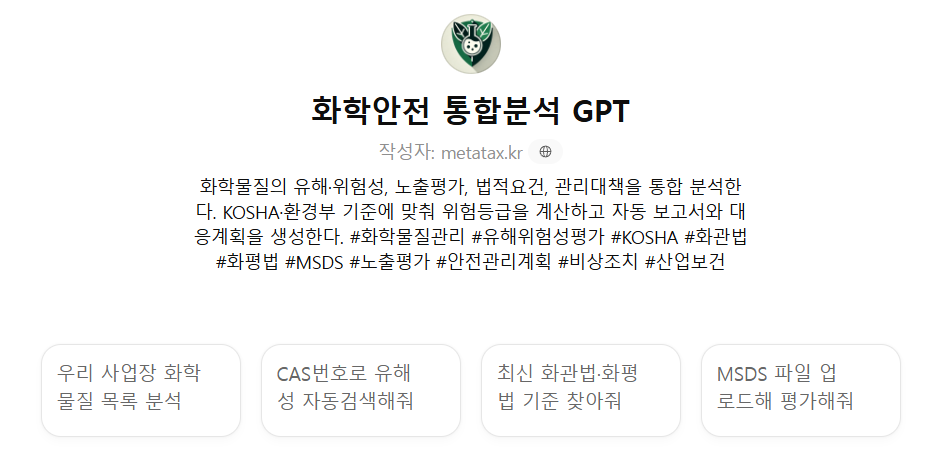 #화학물질관리GPT #유해위험성평가GPT #KOSHA #화관법GPT #화평법GPT #MSDS #노출평가GPT #안전관리계획 #비상조치 #산업보건GPT